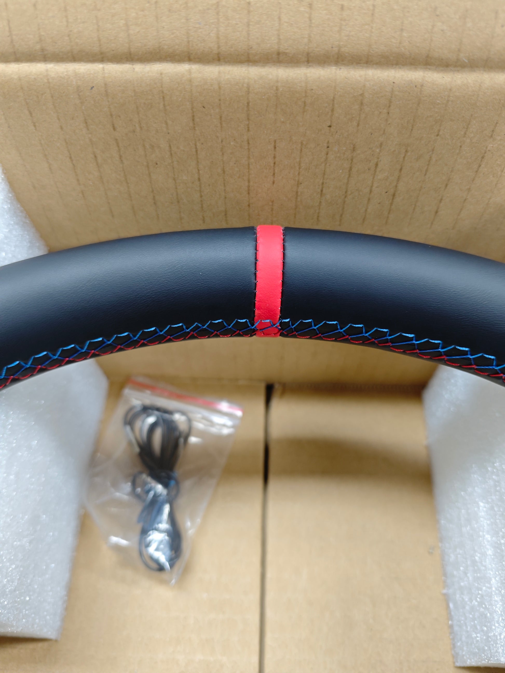 Car steering wheel with BMW logo in a cardboard box with foam padding